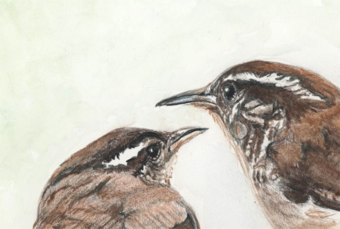 For super sharp details, sharpen the pencil to a fine point, and lay in your drawing using a light touch on dry, hot press paper. Here's a closeup of the detail in a Carolina Wren painting I did. I started with very sharp watercolor pencils, then used a wet brush to go over some of the area to blend and smooth the colors: