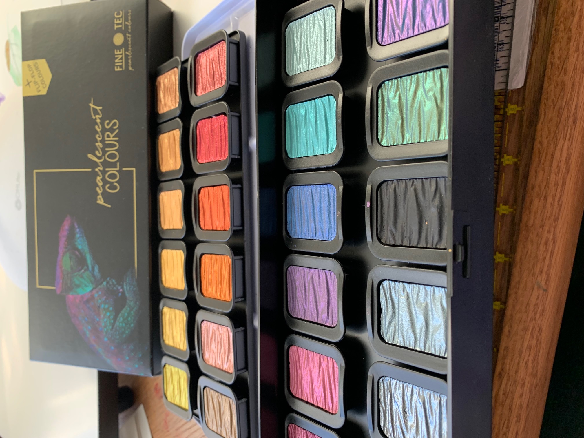 I bought this more expensive set because of all the color choices. The colors are more subtle as you can see below. This is just one brand. There are many, many offerings. Daniel Smith, my favorite paint manufacturer, offers many different metallic and pearlescent colors. And there are some very expensive hand-made colors from various online entrepreneurs such as KMS.