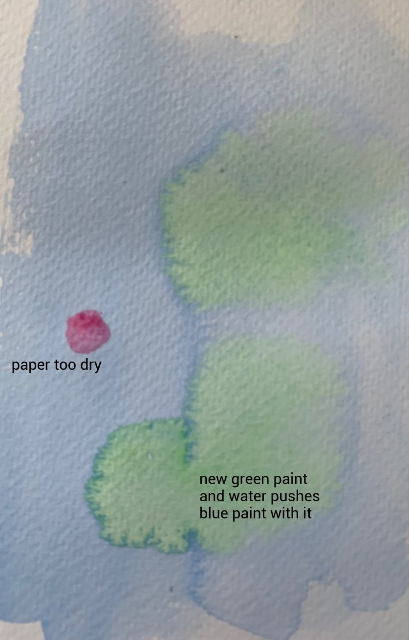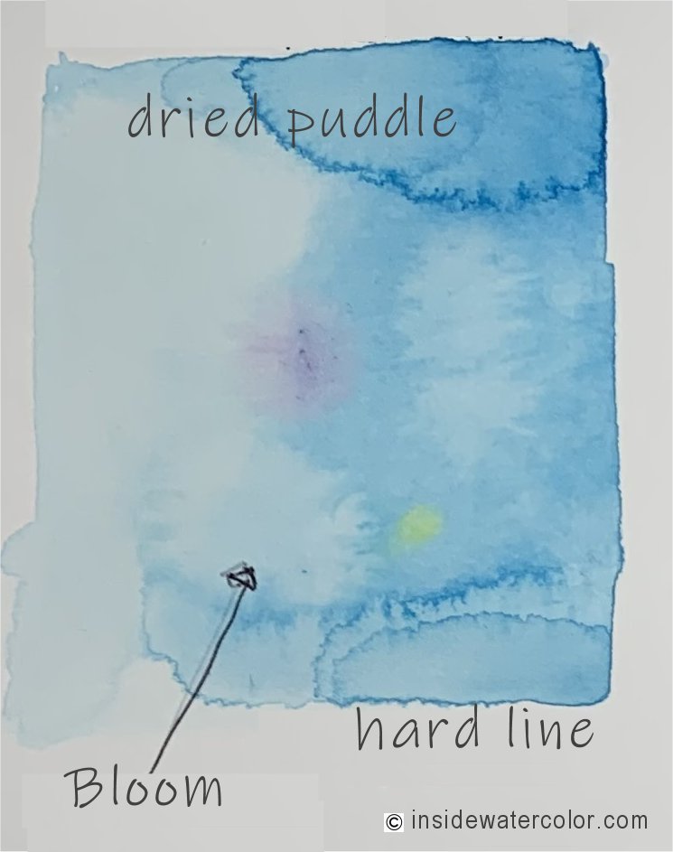Blooms are the result of impatience and a habit of trying to fix a painting when you shouldn't. My bad habit is that once I paint a flat wash of color, I try to then “fix” areas that don’t look right. This is especially bad to do while the paper and paint are still wet. I add more paint and water, but instead of fixing the issue, it creates a big bloom that ruins the flat wash completely. Argh.